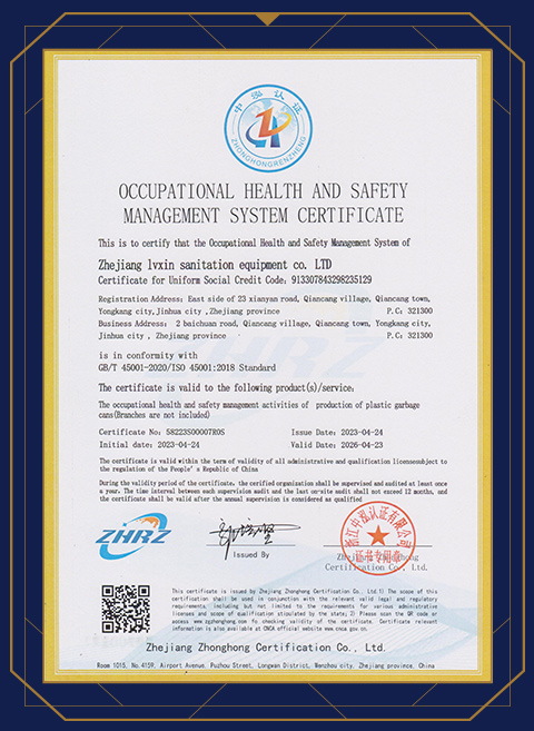 ZHEJIANG LVXIN SANITATION EQUIPMENT CO., LTD is a leading manufacturer of plastic trash cans. Our factory is located in Yongkang City, known as the "Hardware Capital". It covers an area of 18,000 square meters and is equipped with 8 automatic injection molding production lines and more than 60 experienced workers. It focuses on the production of various outdoor trash cans, garbage bins, pedal trash cans, screw-top trash cans, household wastepaper baskets, dustbins, as well as waste recycling equipment used in various apartment buildings, schools, parks, hospitals, hotels, garages, campuses, roadside areas, shopping malls and even industrial zones.